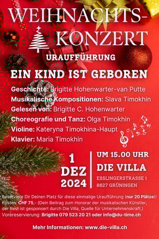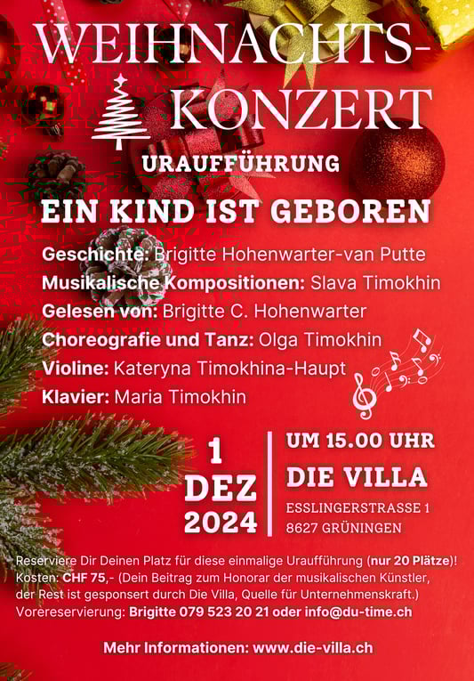 Reservieren Sie Ihre Plätze für das Weihnachtskonzert in der Villa in Grüningen. Limitierte Kapazität, sichern Sie sich schnell ein Ticket!